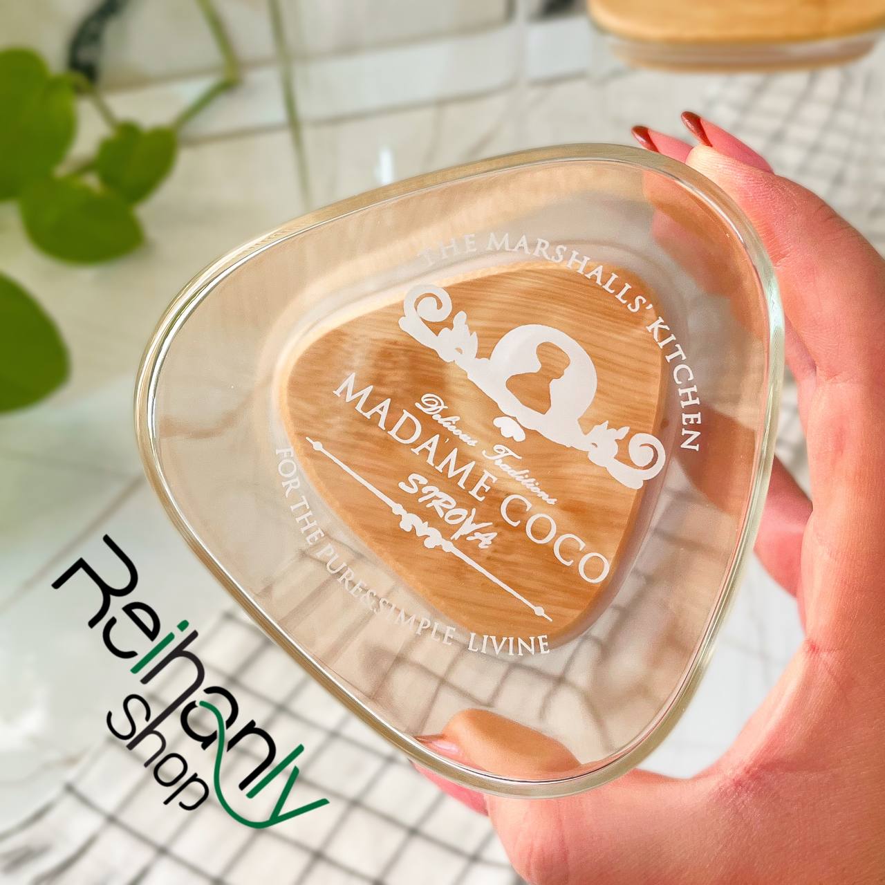بانکه مثلثی مادام کوکو جنس بدنه پیرکس سوپر شفاف و بدون دونه و حباب پیرکس 4 میل جنس درب بامبو (واشر دارد و از ورود هوا جلوگیری میکنه) ارتفاع:10 سانت قطر کف و دهانه:9.5 سانت وارداتی برند مادام کوکو